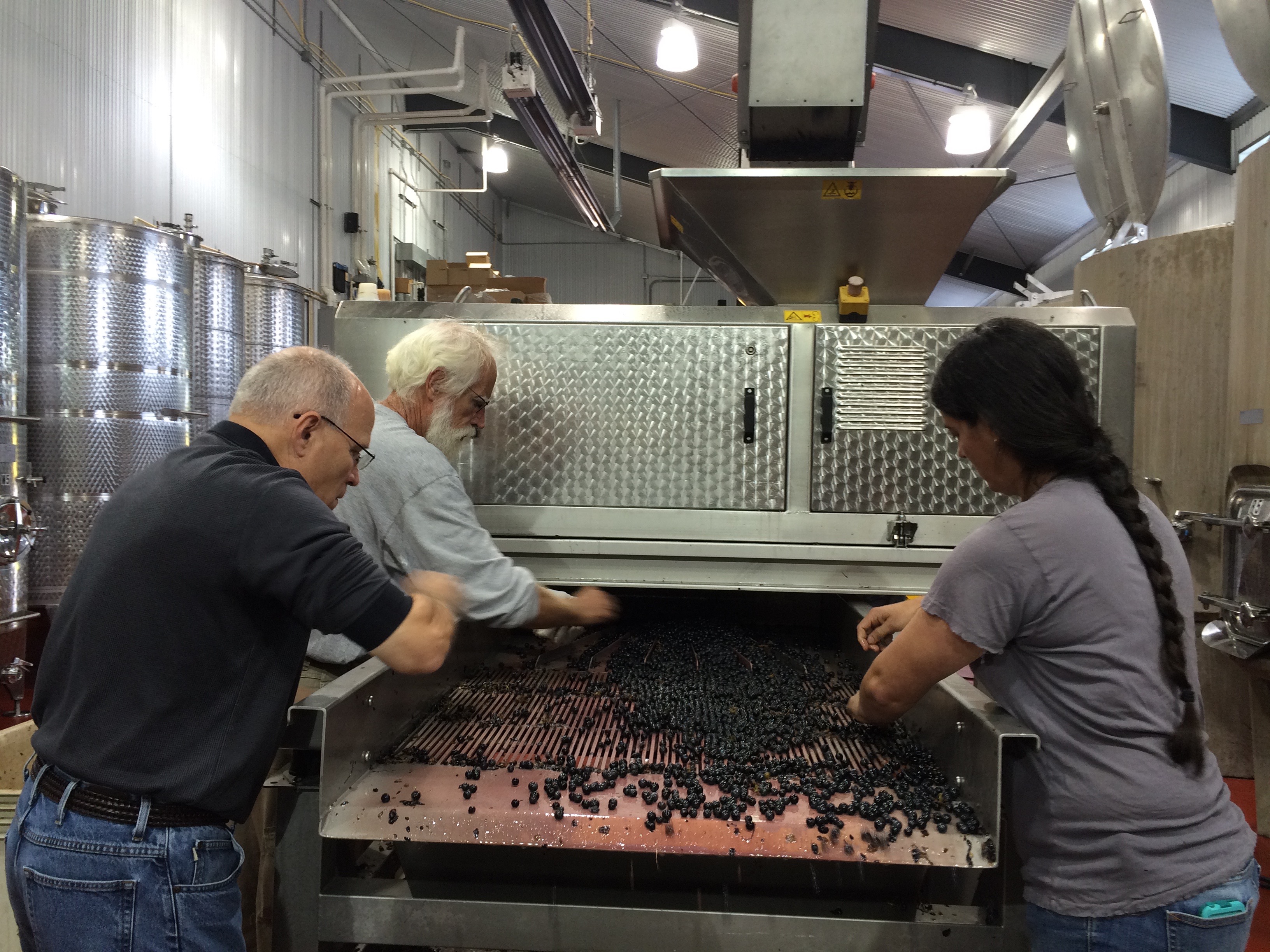 didn't prematurely start to ferment. On Sunday, they started their trek through various pieces of equipment to transition from fruit to wine. First, we sorted to eliminate bad fruit and then the grapes moved from sorting table to conveyor to de-stemmer to bin.