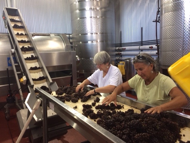 IMG_9426Once the grapes are loaded up, it goes to King Family Winery for processing.  First, it's refrigerated overnight and then the next day it gets sorted--once again looking for bad grapes--and pressed.  The sorting table  always reminds me of  Lucy and Ethyl hiding chocolates in their hats (and elsewhere).   For that reason, I've initiated the Lucy and Ethyl Club for all our friends who graciously volunteer to help with this task.  Pam is the most recent member of this very exclusive club.